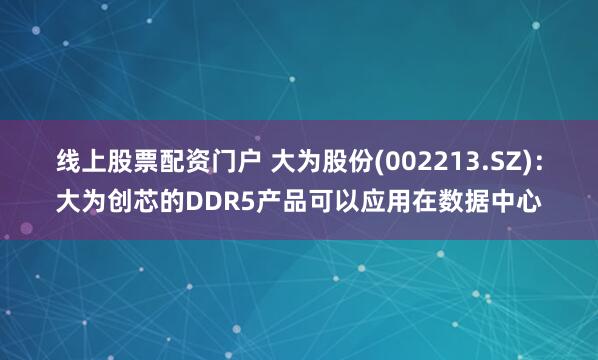 格隆汇1月8日丨大为股份(002213.SZ)在投资者互动平台表示,公司全资子公司深圳市大为创芯微电子科技有限公司(以下简称“大为创芯”)主要产品有NAND、DRAM存储两大系列,DRAM产品线包含DDR3、DDR4、LPDDR4X、LPDDR5、DDR5Memory module产品,NAND产品线包含eMMC等产品;大为创芯的DDR5产品可以应用在数据中心。