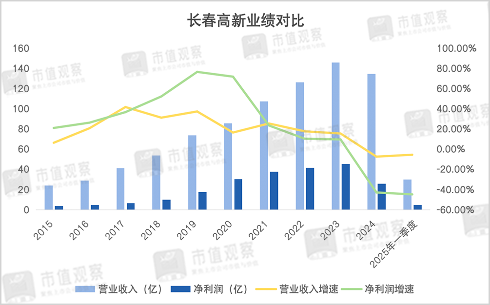 2024年是长春高新业绩显著下滑的一年,营收同比下降了7.55%至134.66亿,降幅虽然不大,但净利润却同比下降了43.01%至25.83亿;今年一季度延续颓势,净利润再次下跌了44.95%。