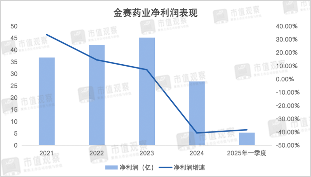 2024年3月浙江省的带量集采开始落地执行,金赛药业的水针剂价格从每支1000元降至300元,降幅达70%。也就在2024年金赛药业的净利润明显滑落,同比降低40.67%至26.78亿,到了2025年一季度情况并没有改善,同比再次下降了38.31%。