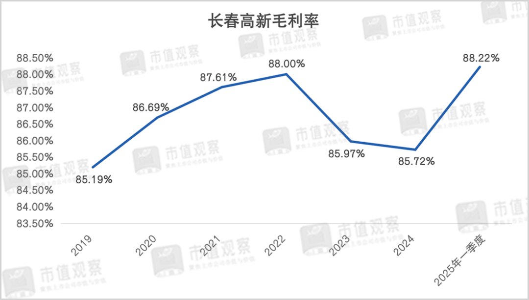 近年来长春高新的产品结构调整取得了一定成果。据长春高新管理层透露,到2024年3月,长效水针的收入占比就已经提升到了29%左右,水针占比下降至接近6成。到2025年一季度长效水针的占比已提升至35%附近,这对稳定其毛利率功不可没,甚至一季度大幅回升至88.22%,还创出了近年来新高。