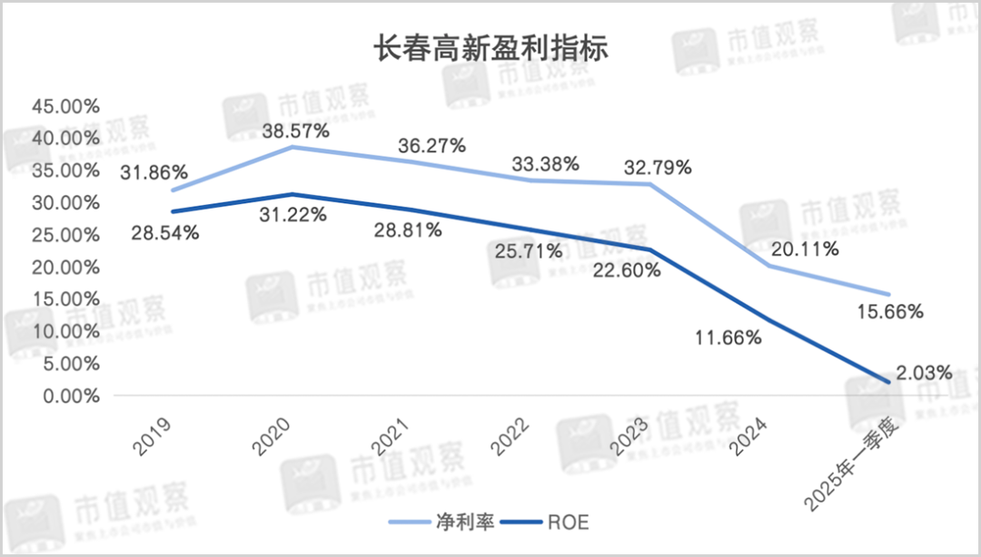 长春高新净利润大降的同时,净资产收益率和净利率等盈利指标也在快速回落。早在2020年长春高新的销售净利率曾达到了38.57%,ROE也达到过31.22%,妥妥的现金奶牛,但到一季度却分别降至15.66%和2.03%。